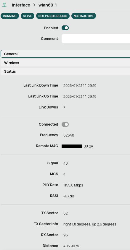 - PHY rate: Theoretical maximum rate of the established connection. It can vary in normal operation depending on traffic.