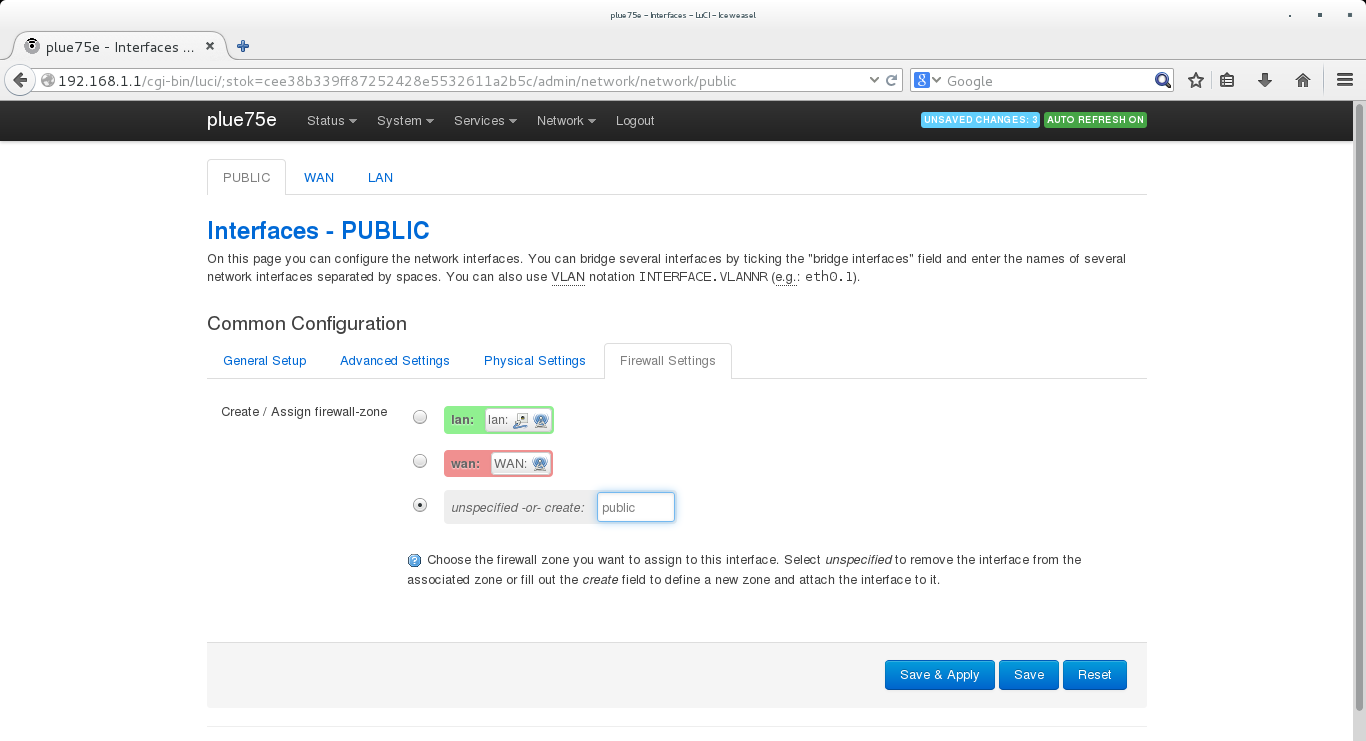 * Unter Firewall Settings eine Firewall-Zone mit dem Name public anlegen