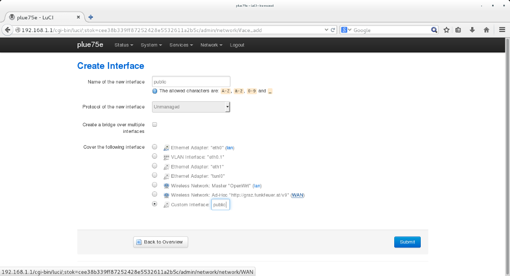 - *ip * Routing control utility (Minimal) ====== Konfiguration ====== * Im Webinterface unter Network → Interfaces → Add new interface… * Name of the new interface public * Protocol of the new interface unmanaged * Custom interface public
