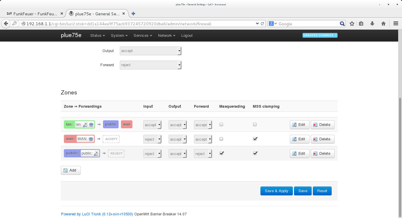 * Unter Network → Firewall jetzt die lan Zone editieren und forward nach public erlauben